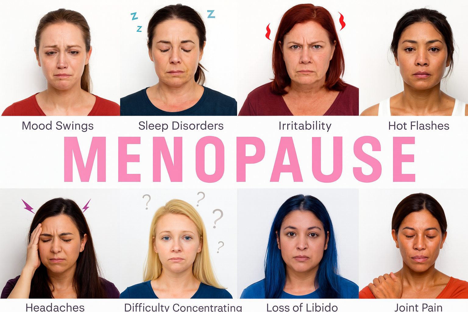 Not every women experience all the symptoms, but if you have any one or more of the following on a regular basis, you may be entering Menopause: Mood swings, depression, difficulty sleeping, irritability, hot flashes, headaches, difficulty concentrating, loss of libido (or increase of libido), joint and other body pain.